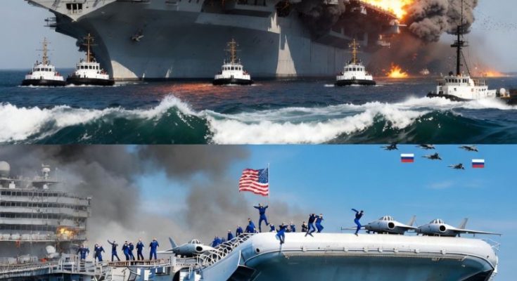 In the sky, Reynolds locked onto the Yak-141. “I’ve got tone—fox three!” he called, launching a missile. But Volkov was ready. With a sharp roll, the Russian jet evaded the shot and countered with lethal accuracy. Another missile struck the Valor, tearing into its hull. Seawater began flooding the lower decks as the mighty ship shuddered violently.