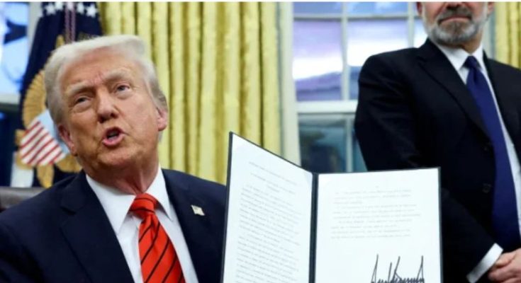 FILE PHOTO: U.S. President Donald Trump holds a signed executive order on tariffs on aluminum imports in the Oval Office of the White House in Washington, U.S., February 10, 2025. REUTERS/Kevin Lamarque//File Photo